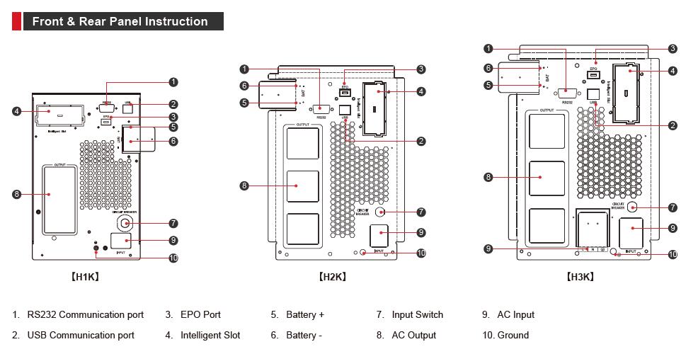 Chaging current | Built-in battery 1K-3K: 1A (Default) 1-2A (Adjustable) Without built-in battery 1KS-3KS: 5A (Default) 1-12A (Adjustable) | |||||