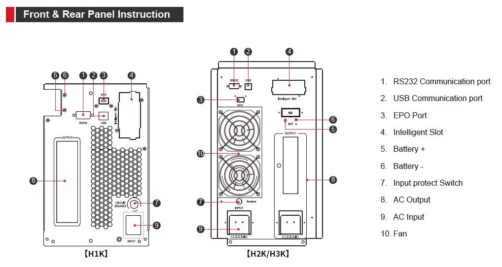 Chaging current | Built-in battery 1K-3K: 1A (Default) 1-2A (Adjustable) Without built-in battery 1KS-3KS: 5A (Default) 1-12A (Adjustable) | |||||