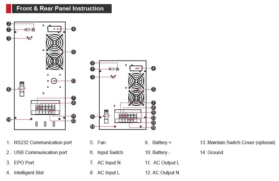 • Standard RS232 communication outlet ,connect UPS and computer to realize multifunctional and multi-purpose monitoring and management operations, available SNMP card (optional) to UPS remote monitoring function.