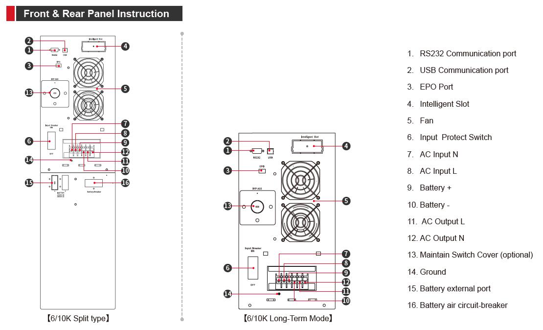 • Standard RS232 communication outlet ,connect UPS and computer to realize multifunctional and multi-purpose monitoring and management operations, available SNMP card (optional) to UPS remote monitoring function