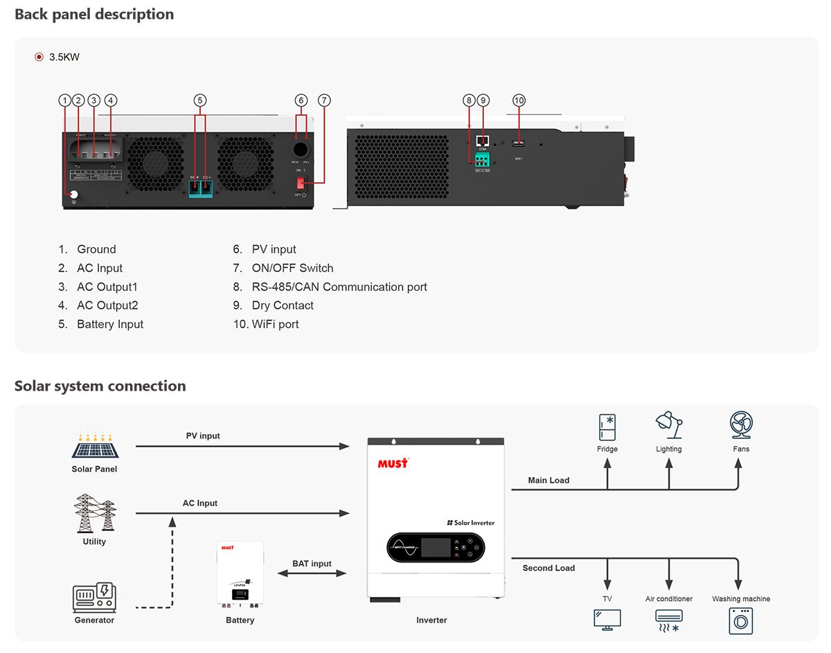 Rated Power | 2000VA/1600W | 2500VA/2500W | 3000VA/3000W | 3500VA/3500W | 5500VA/5500W | 6200VA/6200W |