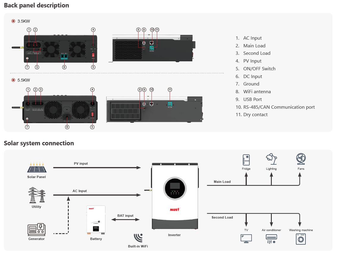Rated Power (Main+Second Load) | 2000VA/1600W | 2500VA/2500W | 3000VA/3000W | 3500VA/3500W | 5500VA/5500W |