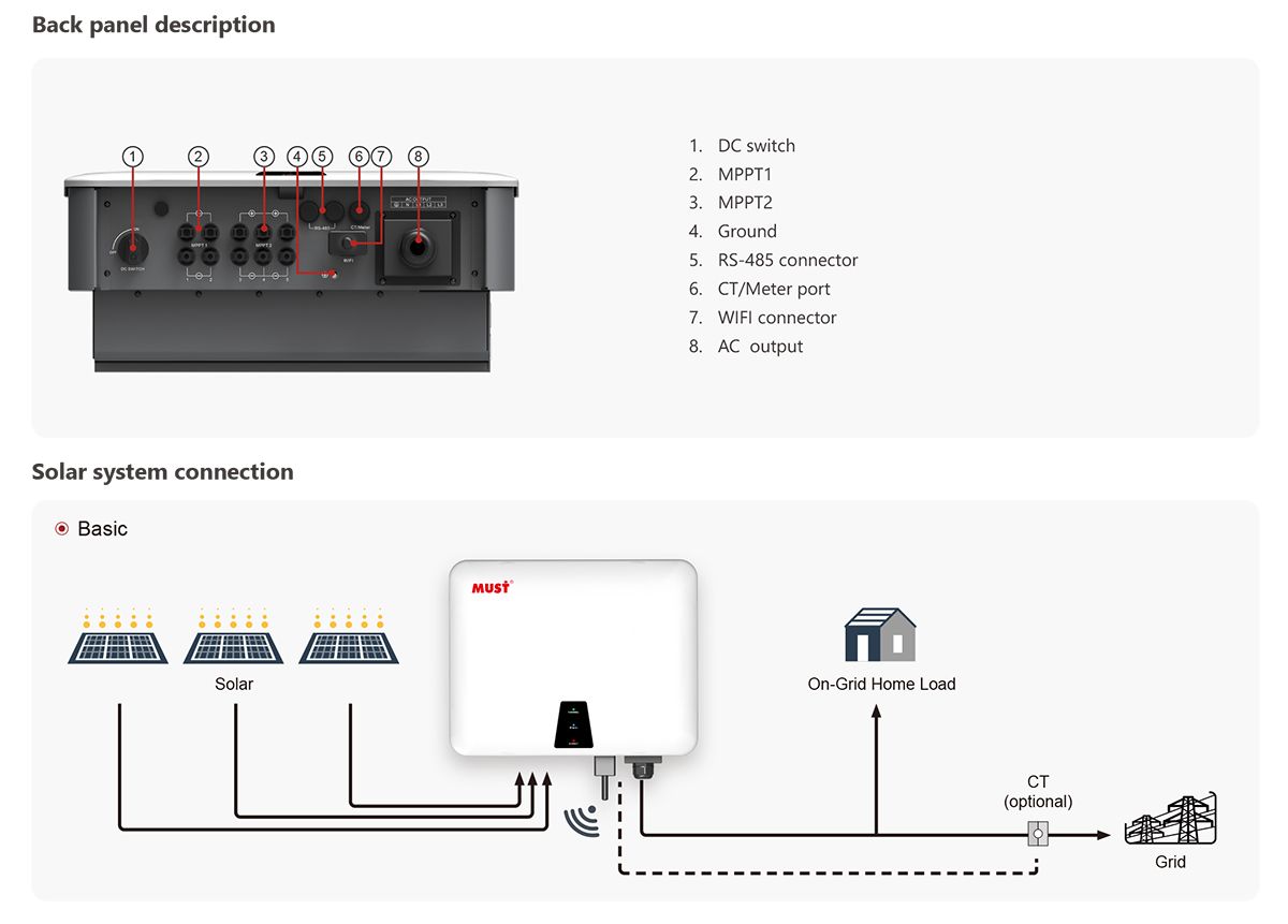 Protection devices | Island protection, DC reverse polarity protection , Output over current protection, Output overvoltage protection-varistor, Integrated DC switch, Ground fault monitoring, Integrated all-pole sensitive leakage current monitoring unit, DC Surge protection, AC Surge protection |