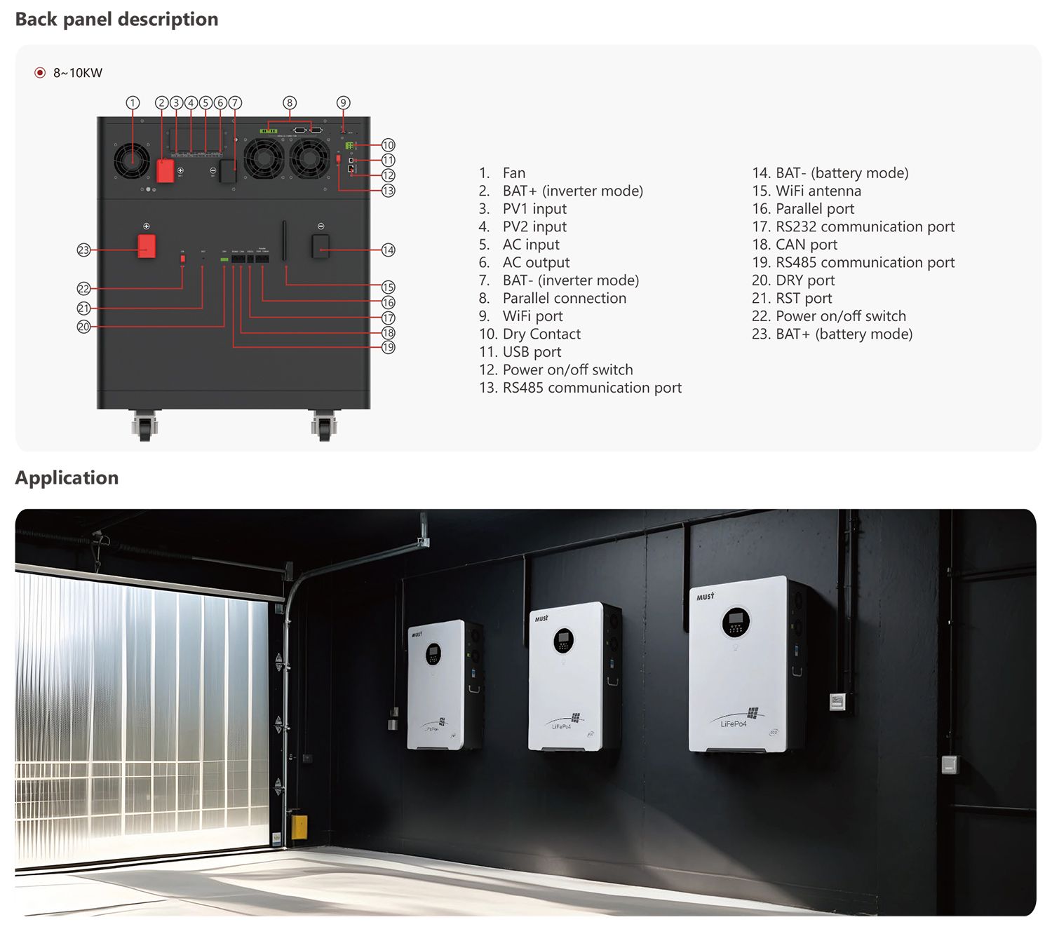 Machine Dimension (W*H*D)(mm) | 480*635*190 | 480*790*200 | Inverter: 600*180*470; Battery: 600*568*470 | |||||